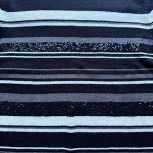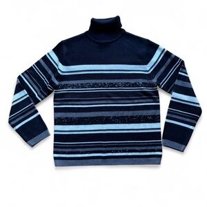 Sag Harbor black turtleneck sweater with grey and white stripes and sequin detail stripes.