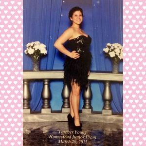 This is a size small strapless black sequin/feathered bustier dress that I originally bought from Bebe and wore to my Junior Prom 😍 It has a side zipper that is really easy to zip up & down. This dress has so many great memories attached with it and honestly I will be sad to see it go😭😭 This dress looks super cute with a pair of simple black heels and a clutch or wristlet that also has sequins. This dress is meant to impress! Perfect for prom, cocktail parties, or any other special event!❤️❤️