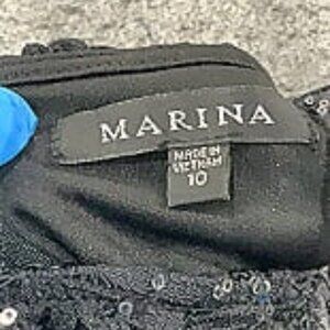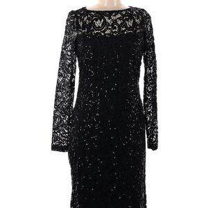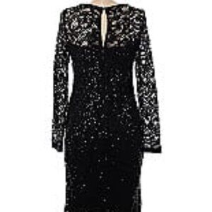 This is a beautiful, black sequined cocktail dress. The lace pattern is a paisley type design with black lining. It is a long sleeved, knee length dress with a crew neckline and a zippered back & hook closure. In very good condition with no flaws. It is made of 90% nylon, 10% spandex. Dress is a size 10.