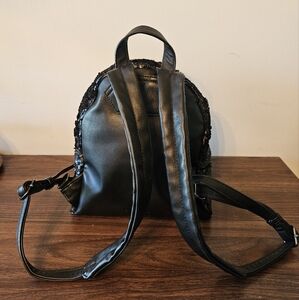 Black Sequined Faux Leather Small Backpack Adjustable Strap Silvertone Hardware
