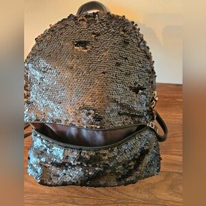 Small to medium balack sequin and faux leather backpack. Adjustable straps with silvertone high quality hardware, zipper closure. Large outside front pocket with zipper, smaller inside pocket with zipper and two open inside card holder/phone pockets.