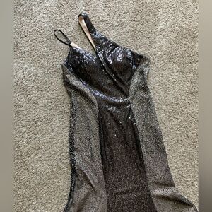 Black Sequins & Beads One Shoulder Evening Dress, Stunning Black Evening Gown