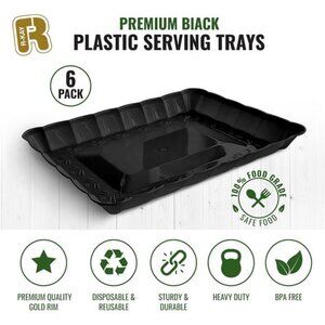Black Serving Trays 6 Pack Plastic Party Platters Buffet Catering 9x13 Inches