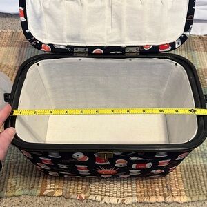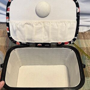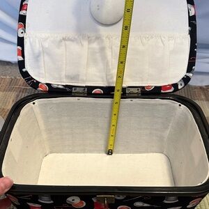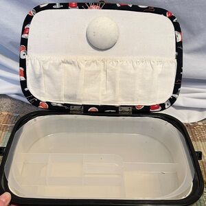 Stylish black sewing box featuring a vibrant spool pattern. Perfect for organizing sewing essentials.