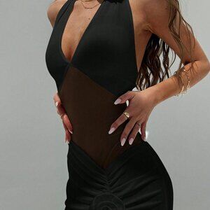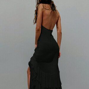 Black Sexy Women's Deep V-Neck Backless Layered Ruffled Hem 3D Floral Dress