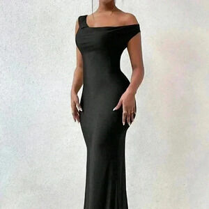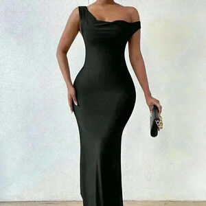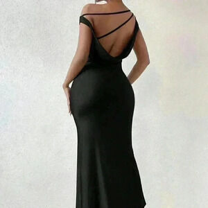 Black Sexy Women's Solid Asymmetrical Neck Open Back Dress