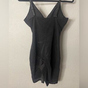 This black shapewear bodysuit features a flattering V-neckline and thin shoulder straps for a sleek look. The form-fitting design extends to the upper thighs, providing a smooth silhouette under clothing. Made from a stretchy material, it is ideal for wearing as a base layer or intimate apparel.