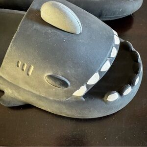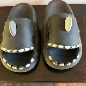 Fun black shark slippers with white teeth details. Perfect for lounging.
