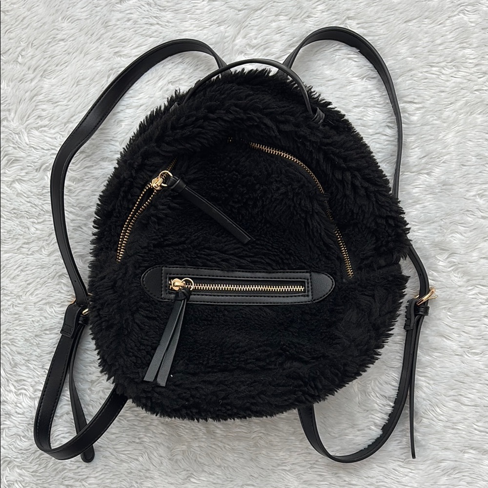 Stylish black shearling backpack with sleek design. Perfect for everyday use.