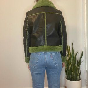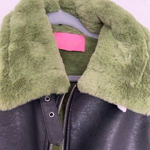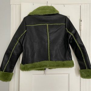 Black faux leather Shearling Jacket with Green Fur. Waist Length. New with tags never been worn. Runs small XL Size but Fits like a Medium/Large. Model in picture normally wears a size Medium.