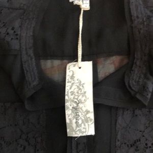 Black Sheer long sleeve Blouse with lace pockets and lace trimmed color. 20 inches arm pit to arm pit. In excellent condition.