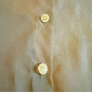 Elegant black sheer blouse with jelwed button-up design and faux fur cuffs. Ideal for a sophisticated look.