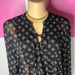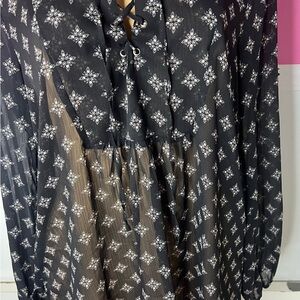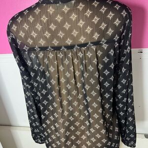 Elegant black sheer blouse featuring a delicate white pattern. Perfect for a chic and stylish look.