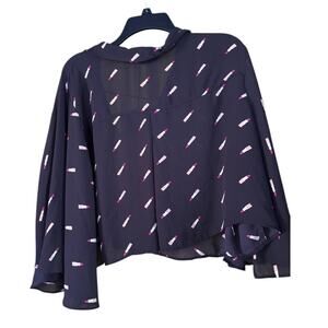 Black Sheer Button Up Blouse with Pink Lipstick Print Flowy Sleeve Trendy Top