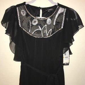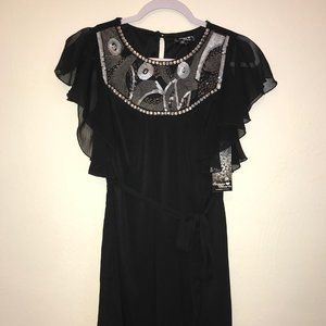 Black sheer dress with waste tie for the perfect fit! The neckline has sequins and sewn detailing and button closure in the back. New with tags.