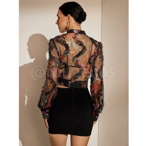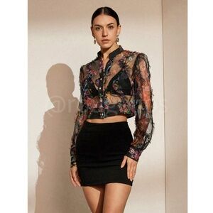 Black Sheer Floral Ruffle Textured Crop Button Up Blouse Shirt Top
