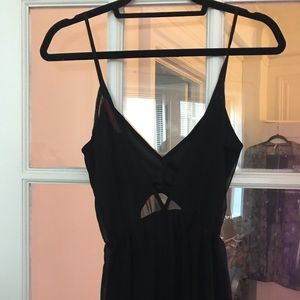 Floor length black dress. Cut out in the front. Slip connected until knee length, sheer maxi dress goes down to floor.