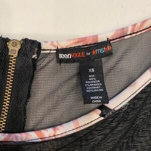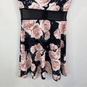 Sweet meets flirty in this fit and flare dress by Teen Vogue for MStyleLab. A pink rose print on black background. Sheer mesh around the midsection and upper back give it a sexy edge while the pattern has a romantic feel! Zipper closure