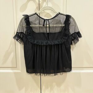 Chic black blouse with sheer fabric and ruffle accents. Perfect for stylish occasions.