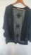 Elegant black sheer kimono top perfect for layering. Features intricate embroidery for a stylish look. Ideal for casual or formal occasions. Size equivalent to an XL.