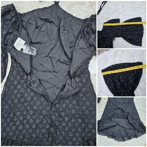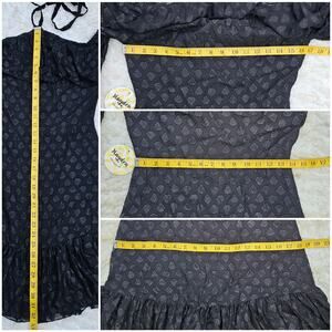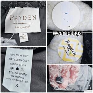 Black semi sheer fabric w/ slightly raised textured geometric design that has a little shimmer/sparkle. Halter neckline (reverse sweetheart/widow's peak), peplum overlay layer on bodice, full lining except for sleeves, ruffled bottom hem. Off Shoulder w/ low cut back, cropped length flared bell sleeves. New, with tags: shelfwear issues noted in photos. Size Small by Hayden Los Angeles.