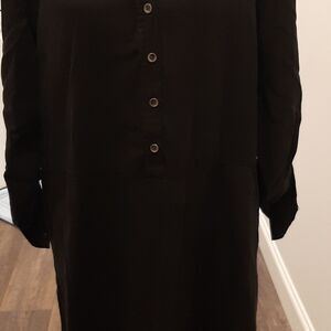 This elegant black shirt dress is perfect for any occasion. Its sleek design offers a timeless look that can be dressed up or down.