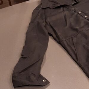 This elegant black shirt dress is perfect for any occasion. Its sleek design offers a timeless look that can be dressed up or down.