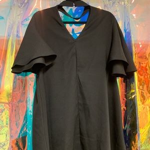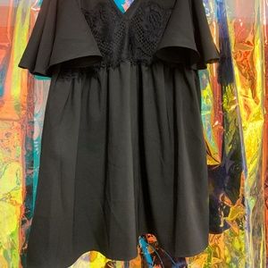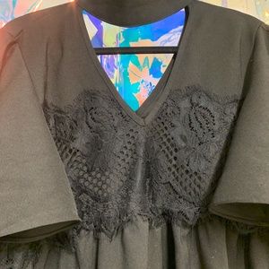 Cute mini short sleeve black dress, lace detailing and opening on the front and back in V neck format