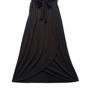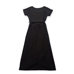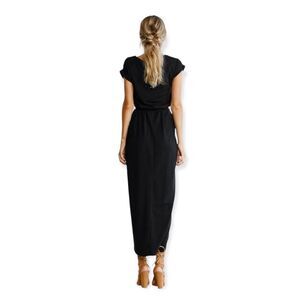Black Short Sleeve Front Split Midi Dress. Short sleeve. Crew cut neckline. Removable waist belt. Soft fabric. Classy & sophisticated. Front split. Midi style✨