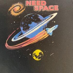 This black short sleeve tee features a vibrant space-themed design, showcasing a colorful spaceship and orbit trail. Made from soft cotton, it offers comfort and style for any casual occasion. The bold 'NEED SPACE' text adds a unique touch to this eye-catching piece.