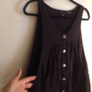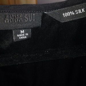 This black silk dress from Anna Sui is absolutely adorable! Featuring low armpit holes (great with t-shirts or turtlenecks underneath), large detailed pockets, silver metal buttons and a short hemline, this piece is classic and fashionable. Missing a drawstring middle (I prefer the loose fit) that could easily be replaced with the tie of your choice.