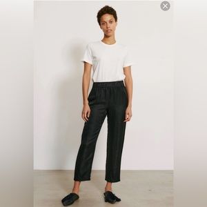 Ankle-length silk pants with two side pockets and two back pockets with an elastic waist for a comfortable fit.