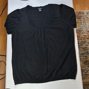 Black short sleeve knit top. Brand: August Silk. Size 2X. 38% viscose 33% silk 29% nylon. Material has slight stretch.