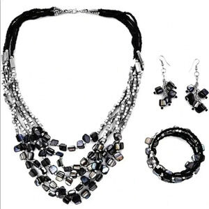 This is for all 3 items! This classic set includes black seed bead earrings, wrap bracelet, and multi strand necklace. Necklace is appx 22” in length, glass beads, lobster clasp, stainless steel hardware. Hypoallergenic. Bundle and save. I ship fast!