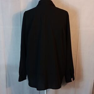Elegant black simi sheer blouse with button-up front. Size 1X with a pit to pit measuring 23" and a length of 30". Features a classic collar and long sleeves.