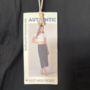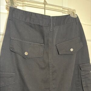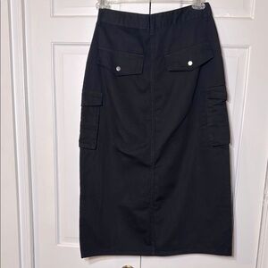This sleek black denim midi skirt is designed with a pencil silhouette, making it an ideal choice for any setting. Its cargo style adds a modern twist, offering a unique blend of sophistication and functionality. Perfect for elevating your wardrobe with a great staple piece.