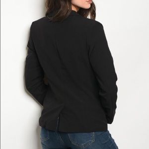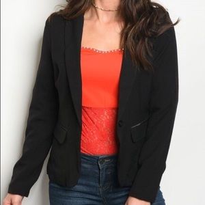 Classic black Long Sleeve blazer with single front button closure and collared detail. Lower slit in back of blazer. Two front lower fake pockets with one upper false pocket.