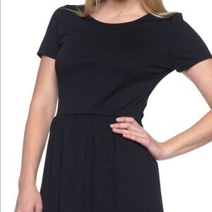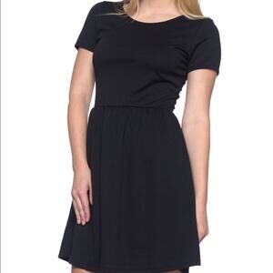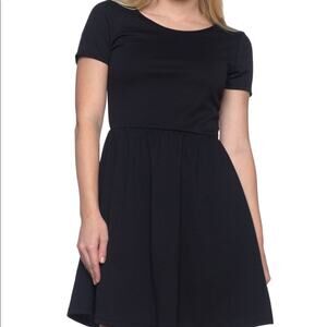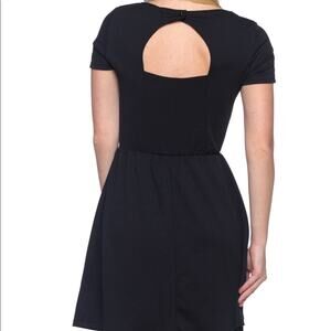 Black skater dress with back keyhole. 96% polyester, 4% spandex. This dress has good stretch to it and an elastic waist.