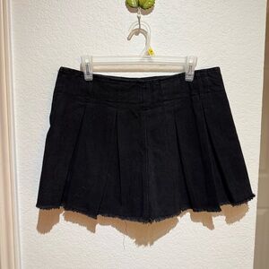 This black mini skirt features a playful skater style with elegant pleats, perfect for a casual day or a night out. Its flared silhouette adds movement and charm, making it a versatile addition to any wardrobe.