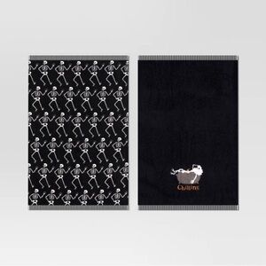 Set of black hand towels with white skeleton design. Perfect for Halloween decor. Glow in the dark fun!