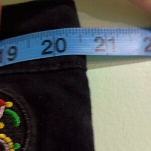 Black skinny jeans with sugar skull and rose patches sewn on. Measurements and fabric content in pictures.