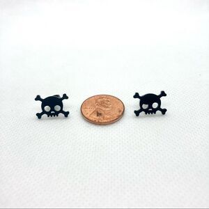A pair of feminine black plated skull and crossbones stud earrings. The face of the earring measures approx 1.5cm in diameter. Shown next to a penny to indicate size. Made of black tone stainless steel.