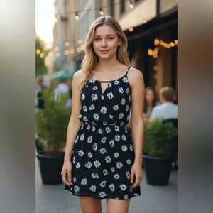 Black Sleeveless Dress with White Daisy Print – Casual Spring/Summer Mini Dress