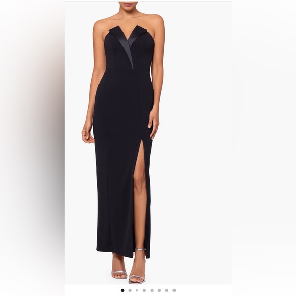This stunning black maxi dress features a daring plunge neckline and a dramatic slit, perfect for making a statement at weddings, proms, or cocktail events. The sleeveless design and bodycon fit create a sleek silhouette, ensuring you look effortlessly elegant. Crafted from a smooth fabric, this gown is a timeless addition to any formal wardrobe.