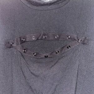 Command attention in this edgy black tank top! A mock neck adds a touch of sophistication, while the sleeveless design keeps you cool and comfortable. The ribbed texture provides a flattering fit, and the eye-catching keyhole cutout with snap detailing adds a daring element. Perfect for a night out, a casual brunch, or adding a touch of flair to your everyday wardrobe.
