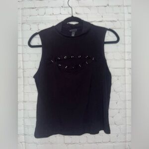 Keywords: black tank top, sleeveless top, mock neck, ribbed knit, keyhole cutout, snap detail, casual top, night out top, womens top, tank top, contemporary, edgy