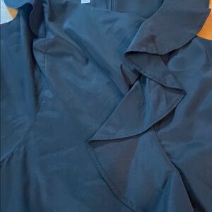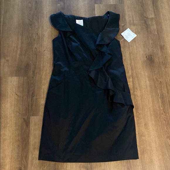 This elegant black dress features a stylish ruffle design, perfect for any occasion. Sleeveless and has pockets for comfort