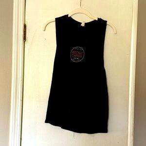 Stylish black sleeveless top featuring a logo on the front. Perfect for casual wear. In excellent used condition. Size medium. A rock touring company.