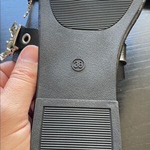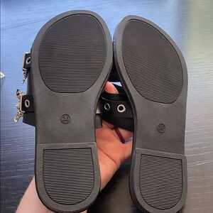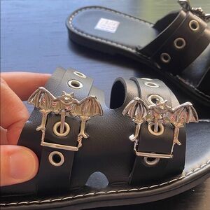 Stylish black slide sandals featuring silver bat accents and eyelet details.