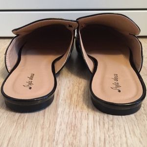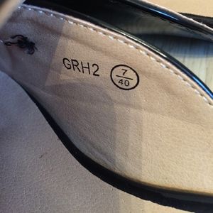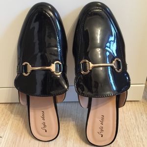 Black faux patent leather slides. NEVER WORN. The brand is Style Shoes and they are a size 7. Gold Hardware. Smoke free home.